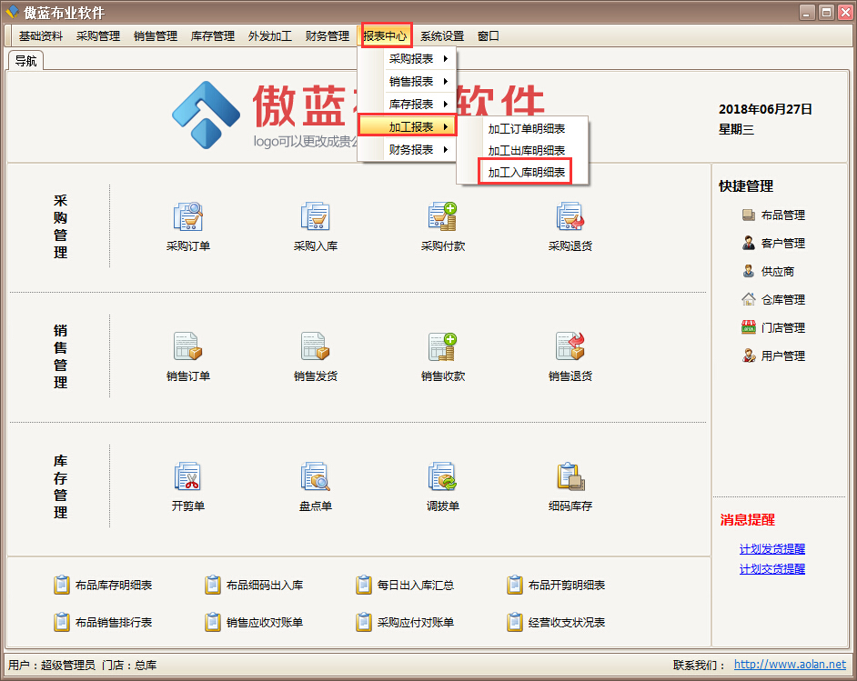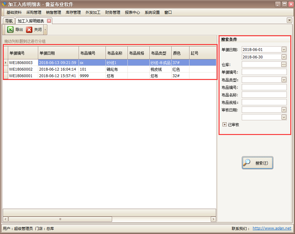 傲藍布業管理軟件查看加工入庫的布匹情況報表: