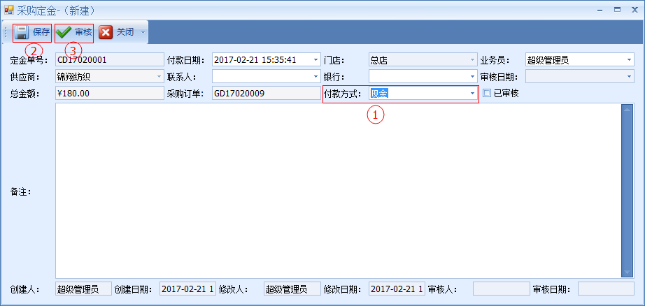 填寫好采購訂單后點擊審核確定該單據生效并且該單據以后不能進行修改,根據采購訂單可以生成采購入庫單,同時也可以對該單據進行一個定金支付登記。