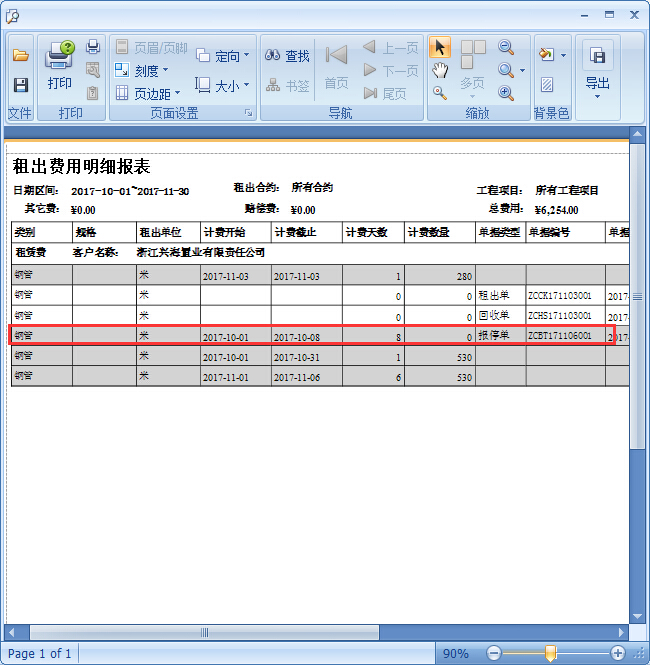 2、報(bào)停單建立完成,可以在【報(bào)表管理】【運(yùn)行報(bào)表】“租出費(fèi)用明細(xì)報(bào)表”中查看該客戶具體的報(bào)停明細(xì),報(bào)停期間材料租賃費(fèi)用也是不計(jì)算的。如圖: