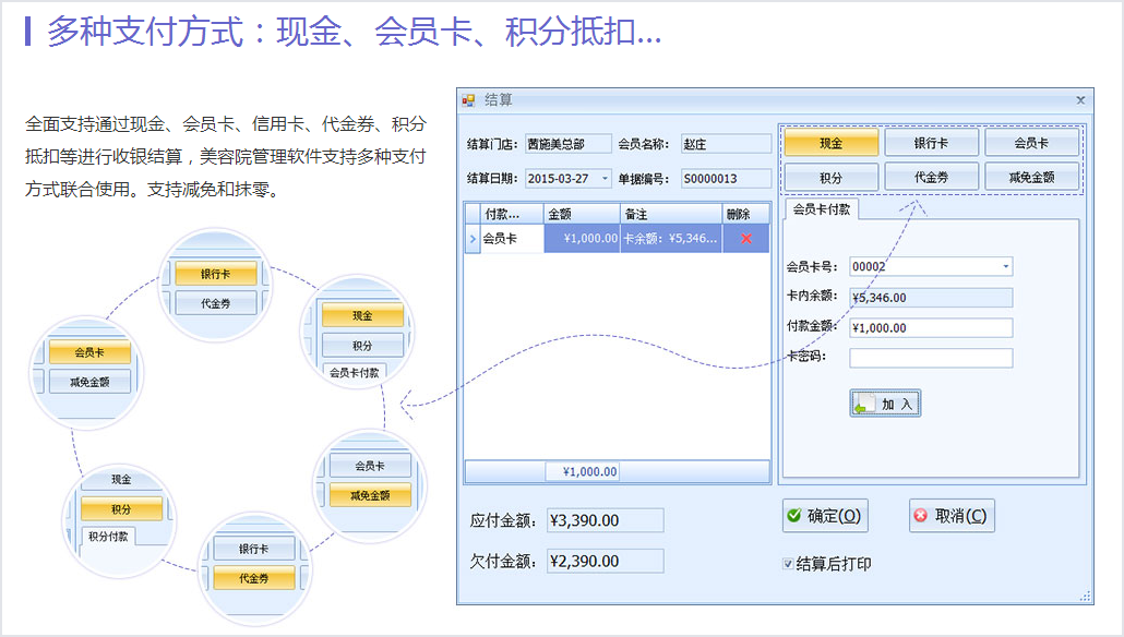傲藍美容院收銀軟件支持多種支付方式為美容院提升競爭力