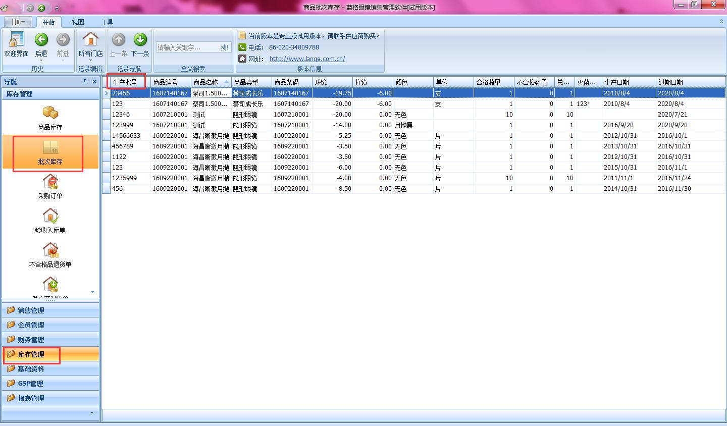 傲藍眼鏡店管理軟件,依據《2014版醫療器械管理政策》中的醫療器械管理軟件要求開發,只要你在隱形眼鏡入庫時把產品批號、生產批次等產品信息錄入到軟件中,那么在庫存管理,批次管理里就能查看所有的產品批號的商品,軟件就能符合隱形眼鏡銷售的管理。