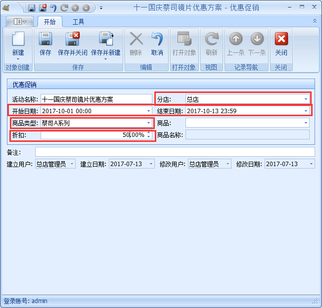 3、節假日折扣優惠,眼鏡店一般會在節假日的時候推出更大規模的節假日優惠促銷活動來提升業績,那么傲藍眼鏡店會員管理軟件又是怎么協助門店操作的呢?