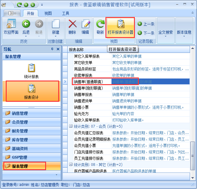 1、點(diǎn)擊軟件【報(bào)表管理】→【報(bào)表設(shè)計(jì)】→選擇“銷(xiāo)售單(普通眼鏡)”[以不同眼鏡銷(xiāo)售單為例],點(diǎn)擊軟件菜單欄上的“打開(kāi)報(bào)表設(shè)計(jì)器”如圖: