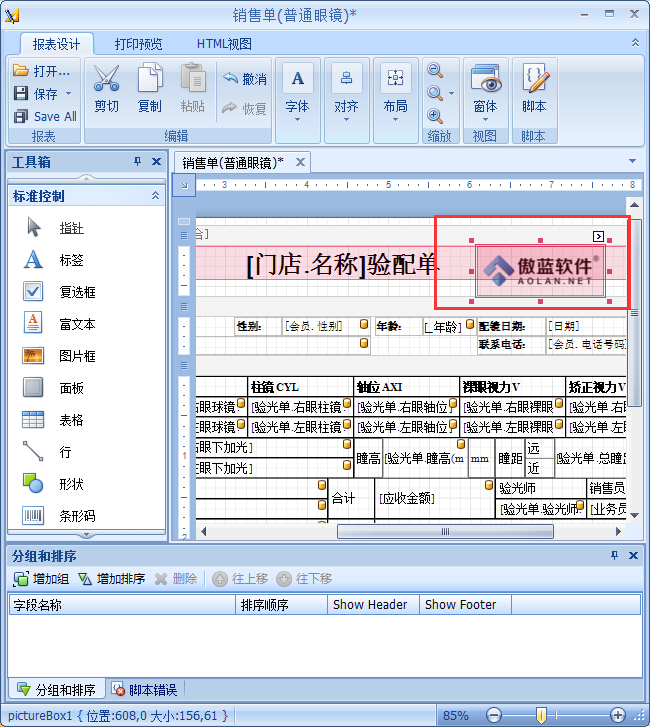 2、進(jìn)入銷(xiāo)售單(普通眼鏡)單據(jù)設(shè)計(jì)界面,需要在單據(jù)表頭加上門(mén)店的LOGO時(shí),點(diǎn)擊左側(cè)“工具箱”欄目的“圖片框”將其拖拽到單據(jù)合理的位置,如圖: