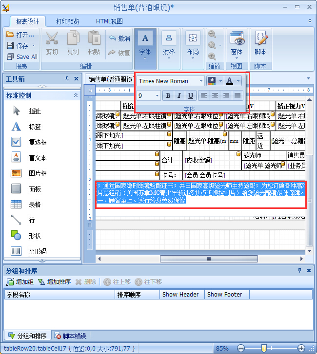 3、根據(jù)眼鏡門(mén)店的需求,傲藍(lán)眼鏡管理系統(tǒng)報(bào)表設(shè)計(jì)功能還支持,將門(mén)店的眼鏡保修條款或者服務(wù)條款添加到單據(jù)上,方便展示眼鏡店的實(shí)力,或者給予客戶(hù)溫馨提示等信息,添加之后,軟件還支持調(diào)整文字的字體和大小,保存報(bào)表設(shè)計(jì)即可,如圖: